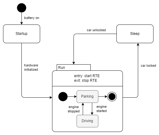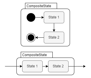 Also defines a sub-state machine, but the internal states are modelled directly in the same