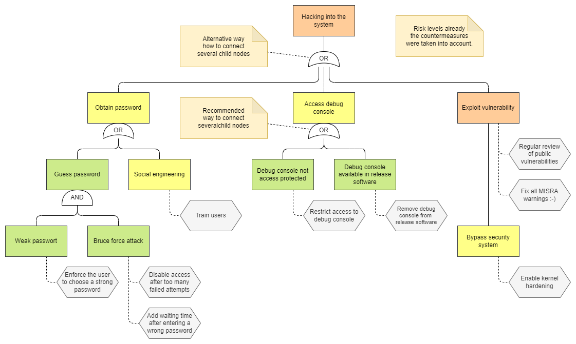 Each node has a risk level, which may vary depending on whether or not countermeasures are considered. These levels are usually described and discussed in an extra table or special analysis tools. Optionally, the nodes can be colored according to the Risk Levels table. It must be clear from the context whether the risk levels are shown with or without countermeasure considerations. If not, add an explicit description to the diagram.